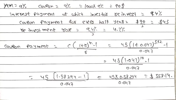 . Suppose that an investor with a five-year investment horizon is considering purchasing a seven-year 9% coupon bond selling at par. The investor expects that he can reinvest the coupon payments at an annual interest rate of 9.4% and that at the end of the investment horizon two-year bonds will be selling to offer a yield to maturity of 11.2%. What is the five-year total return for this bond?