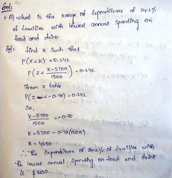 1. The U.S. Bureau of Labor Statistics reports that the average annual expenditure on food and drink for all families is $5,700 (Money, December 2003). Assume that annual expenditure on food and drink is normally distributed and that the standard deviation is $1,500. (50 points) (A) What is the range of expenditures of the 24.2% of families with the lowest annual spending on food and drink? (B) Assume total number of families is 500,000. How many families spend more than $7000 annually on food and drink? 2. The average base salary for a store manager (Wal-Mart) in Riverside, California, is $68,000, and the average base salary for a store manager (Wal-Mart) in Los Angeles, California, is $78,000. Assume that salaries are normally distributed, the standard deviation for store managers in Riverside is $20,000, and the standard deviation for store managers in Los Angles is $22,000. (75 points) (A) What is the probability that a store manager in Riverside has a base salary in excess of $100,000? (B) What is the probability that a store manager in Los Angeles has a base salary in excess of $100,000? (C) What is the probability that a store manager in Los Angeles has a base salary of less than $67,000? (D) How much would a store manager in Los Angeles have to make in order to have a higher salary than 98.21% of the store managers in Riverside? (E) Based the results from (A)-(D), if you are a job applicant for store manager position (Wal-Mart) in California, how would you negotiate annual salary using at least 200 words.