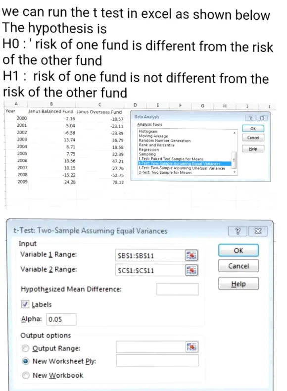 Nicholas Grammas is an investment analyst examining the performance of two mutual funds with Janus Capital Group: The Janus Balanced Fund and the Janus Overseas Fund.The following table reports the annual returns (in percent) of these two funds over the past 10 years. We assume the sample returns are drwan independently from normally distributed populations.