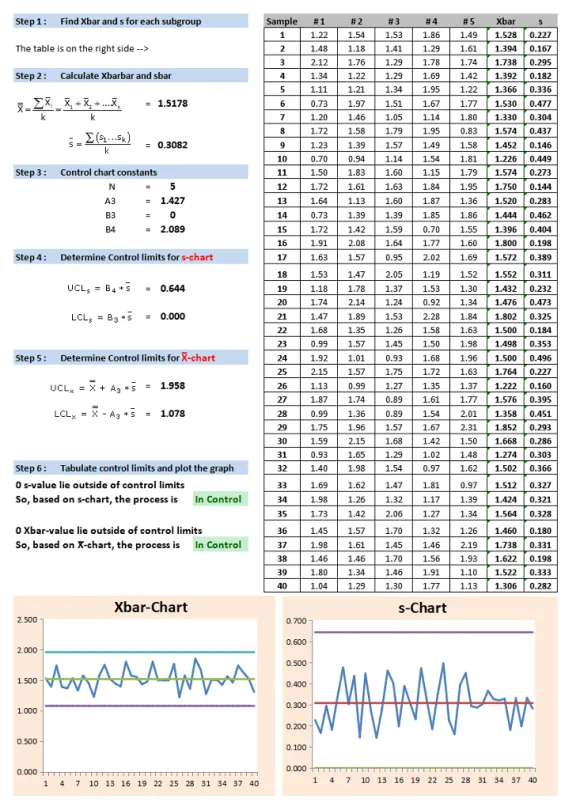 a. compute the sample means and the average standard deviation, calculate the control limits, and plot them on control charts.