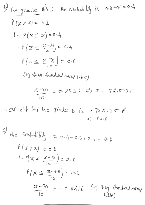 The final marks in a statistics course are normally distributed with a mean of 70 and a variance of 100. The professor must convert all marks to letter grades. He decides that he wants 10% A's, 30% B's, 40% C's, 15% D's and 5% F's. Determine the cutoffs for each letter grade.