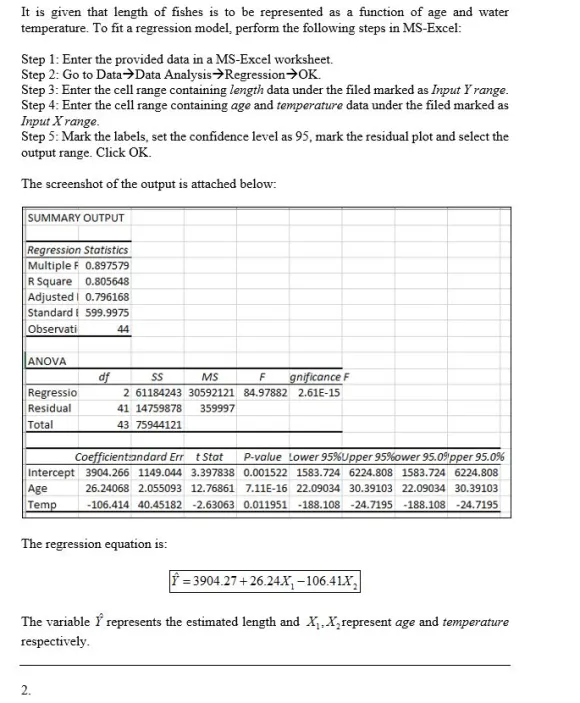 REGRESSION. The length of a species of fish is to be represented as a function of the age (measured in days) and water temperature (degrees Celsius). The fish are kept in tanks at 25, 27, 29 and 31 degrees Celsius. After birth, a test specimen is chosen at random every 14 days and its length measured. The dataset is presented below. What is the estimated regression equation?