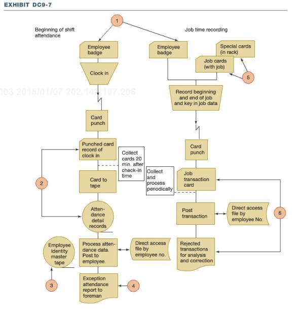 b. Assume that Exhibit DC9-7 is the system description in Alouette’s prior year’s audit file. During the current year, the company converted to an electronic security card system. Each employee is issued a security card with a magnetic stripe containing his or her identity code. At the start of the shift the employee swipes his or her security card to enter the factory floor. Using an internal clock, the scanner generates a start time entry in the system’s attendance detail records file. The employee then reports to the floor supervisor to be assigned to a job for his or her shift. The supervisor uses a terminal that displays a real-time list of checked-in employees, and enters the job number assignment beside the employee’s name. The job costing system automatically creates an open daily job transaction entry. At the end of the shift the employee swipes his or her card to exit the factory floor and the total shift time is entered to the open job transaction. The daily job transaction entry is then closed and a labor charge entry for the employee’s shift is generated in the job costing system and in the payroll file.