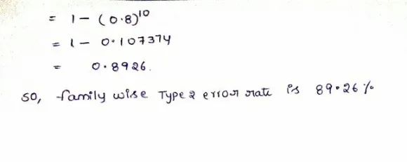 = 1- (0.8)'0 =1-0107374 = 0.8926. so, family wise Type a erroor rate is 89.26%