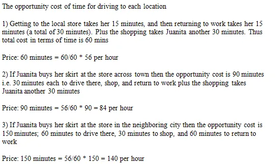 Determining opportunity cost Juanita is deciding whether to buy a skirt that she wants, as well as where to buy it. Three stores carry the same skirt, but it is more convenient for Juanita to get to some stores than others. For example, she can go to her local store, located 15 minutes away from where she works, and pay a marked-up price of $100 for the skirt: Store Travel Time Each Way Price of a Skirt (Minutes) (Dollars per skirt) Local Department Store 15 100 Across Town 30 86 Neighboring City 60 63 Juanita makes $56 an hour at work. She has to take time off work to purchase her skirt, so each hour away from work costs her $56 in lost income. Assume that returning to work takes Juanita the same amount of time as getting to a store and that it takes her 30 minutes to shop. As you answer the following questions, ignore the cost of gasoline and depreciation of her car when traveling. Complete the following table by computing the opportunity cost of Juanita's time and the total cost of shopping at each location. Store Opportunity Cost of Time Price of a Skirt Total Cost (Dollars) (Dollars per skirt) (Dollars) Local Department Store 100 Across Town 86 Neighboring City 63 Assume that Juanita takes opportunity costs and the price of the skirt into consideration when she shops. Juanita will minimize the cost of the skirt if she buys it from the _____ .