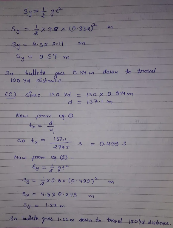A .22 rifle bullet is fired in a horizontal direction with a muzzle velocity of 900 ft/sec. In the absence of air resistance, how far will it have dropped in traveling a horizontal distance of (a) 50 yd? (b) 100 yd? (c) 150 yd? (d) How far will it drop in one second?