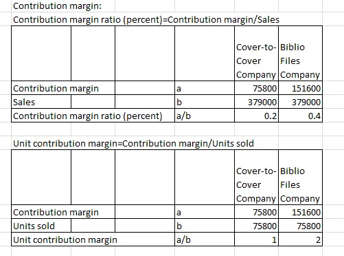 Review the The excess of sales over variable costs.contribution margin income statements for Cover-to-Cover Company and Biblio Files Company on their respective Income Statements. Complete the following table from the data provided on the income statements. Each company sold 75,800 units during the year.