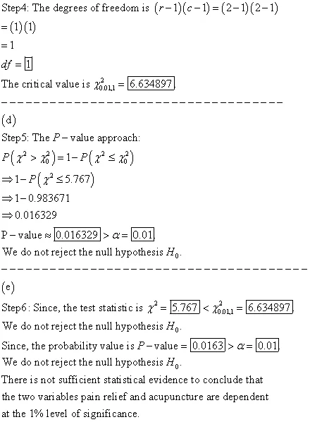 Migraine and Acupuncture: A migraine is a particularly painful type of headache, which patients sometimes wish to treat with acupuncture. To determine whether acupuncture relieves migraine pain, researchers conducted a randomized controlled study where 163 patients diagnosed with migraine headaches were randomly assigned to one of two groups: treatment or control. 65 patients in the treatment group received acupuncture that is specifically designed to treat migraines. 98 patients in the control group received placebo acupuncture (needle insertion at non-acupoint locations). 24 hours after patients received acupuncture, they were asked if they were pain free. Results are summarized in the contingency table below. Test to see if migraine pain relief is dependent on receiving acupuncture. Use αα = 0.01.