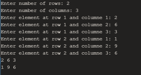 #include <vector> #include <iostream> #include <string> using namespace std; int main() { int rows, columns, num; vector<vector<int> > matrix; // ask user for how many rows and columns cout << "Enter number of rows: "; cin >> rows; cout << "Enter number of columns: "; cin >> columns; // ask and read matrix for (int i = 0; i < rows; ++i) { vector<int> temp; for (int j = 0; j < columns; ++j) { cout << "Enter element at row " << i + 1 << " and columne " << j + 1 << ": "; cin >> num; temp.push_back(num); } matrix.push_back(temp); } // print matrix for (int i = 0; i < matrix.size(); ++i) { for (int j = 0; j < matrix[i].size(); ++j) { cout << matrix[i][j] << " "; } cout << endl; } cout << endl; return 0; }