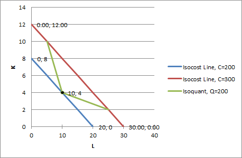 We can see that isocost line (C=200) is tangent to isoquant line (Q=200) at L=10 and K=4
