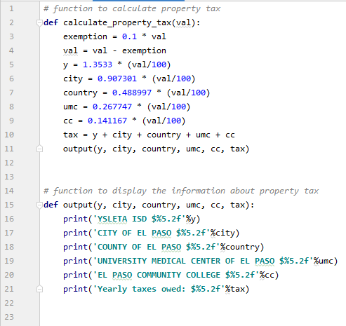 # function to calculate property tax def calculate_property_tax(val): exemption = 0.1 * val val = val - exemption y = 1.3533 * (val/100) city = 0.907301 * (val/100) country = 0.488997 * (val/100) umc = 0.267747 * (val/100) cc = 0.141167 * (val/100) tax = y + city + country + umc + cc output(y, city, country, umc, cc, tax) # function to display the information about property tax def output(y, city, country, umc, cc, tax): print('YSLETA ISD $%5.2f'%y) print('CITY OF EL PASO $%5.2f'%city) print('COUNTY OF EL PASO $%5.2f'%country) print('UNIVERSITY MEDICAL CENTER OF EL PASO $%5.2f'%umc) print('EL PASO COMMUNITY COLLEGE $%5.2f'%cc) print('Yearly taxes owed: $%5.2f'%tax)