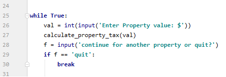f = '' while f != 'quit': val = int(input('Enter Property value: $')) calculate_property_tax(val) f = input('continue for another property or quit?')