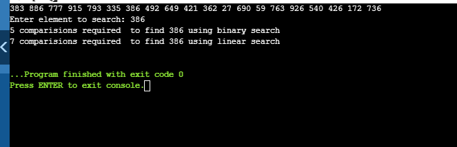 C++Design and implement a program (name it LinearBinarySearch) to implement and test the linear and binary search algorithm discussed in the lecture slides. Define method LinearSearch() to implement linear search of an array of integers. Modify the algorithm implementation to count number of comparisons it takes to find a target value (if exist) in the array. Define method BinarySearch() to implement binary search of an array of integers. Modify the algorithm implementation to count number of comparisons it takes to find a target value (if exist) in the array. Now, develop a test method to read integer values from the user in to an array and then call methods LinearSearch() and BinarySearch() and printout the number of comparison took to find the target values using each search method. Document your code and organized your outputs as follows: Arrays Values: Target value: Linear Search Comparisons: Binary Search Comparisons:
