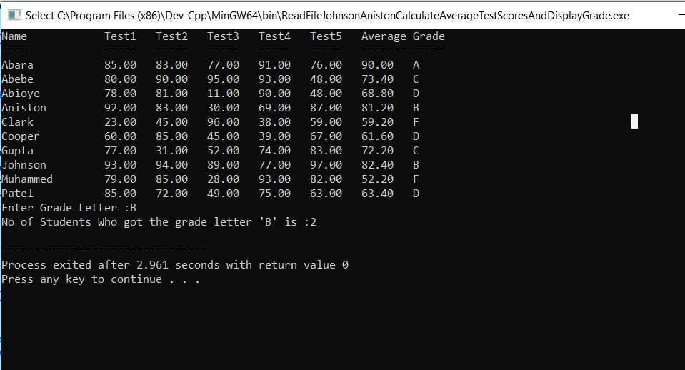 Write a program to sort the student’s names (ascending order), calculate students’ average test scores and letter grades (Use the 10 point grading scale). In addition, count the number of students receiving a particular letter grade. You may assume the following input file data :