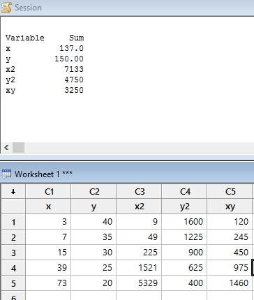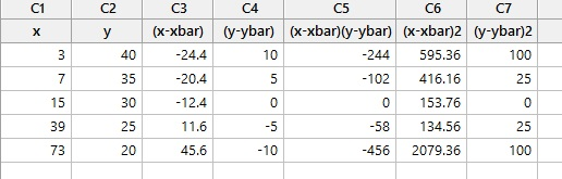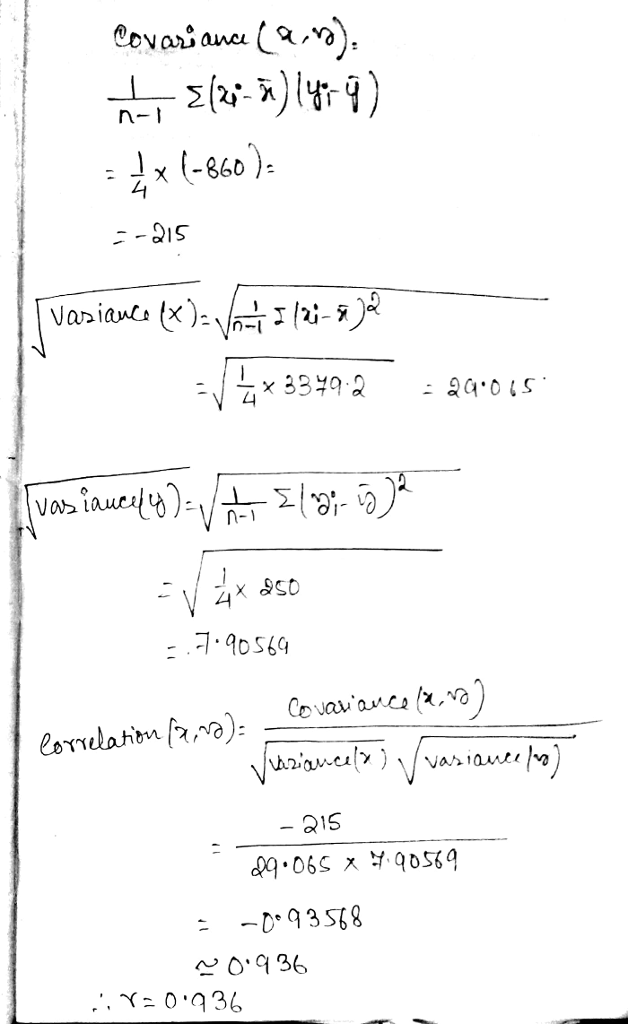 (c) Use a calculator to verify that Σx = 137, Σx2 = 7133, Σy = 150, Σy2 = 4750, and Σxy = 3250. Compute r. (Round your answer to three decimal places.) r =