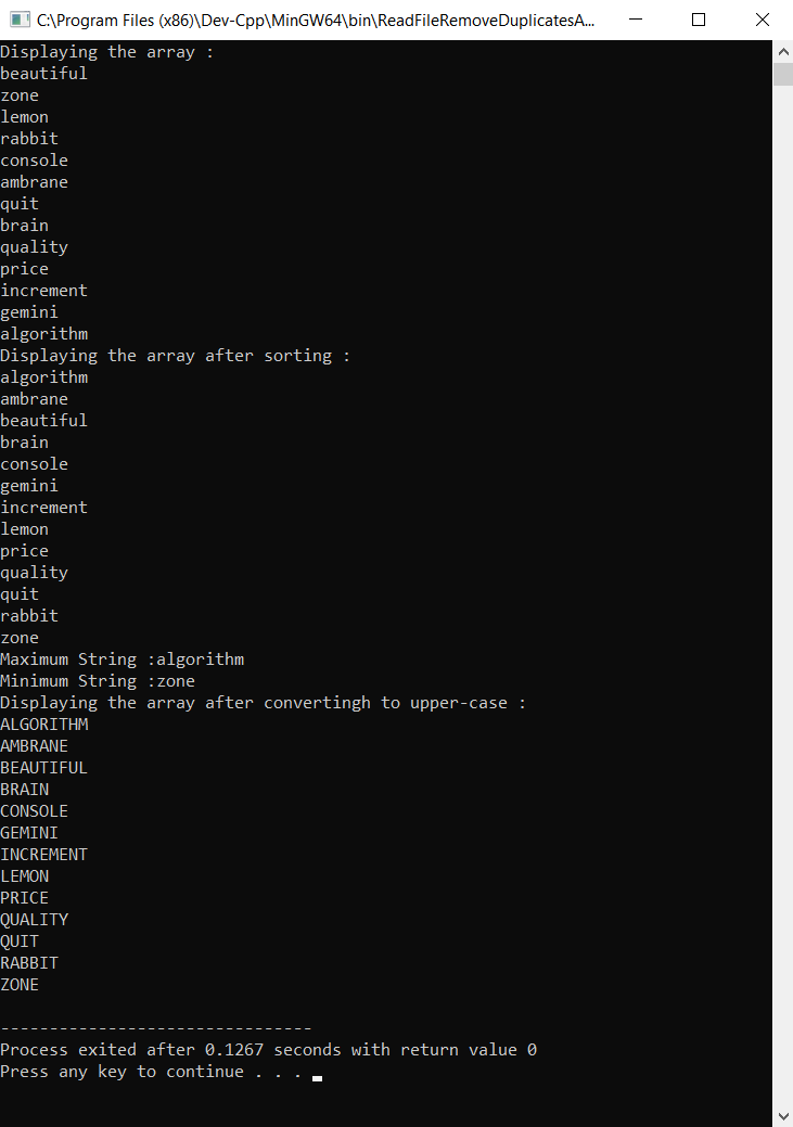 2- Now write a program that reads the words in the file into an array of strings (a repeated word should not be inserted into the array – your program should not allow that and you should make sure your data file has duplicate words to test this functionality). Make your array size enough to hold 1000 words. To read the words into the array, you should make a function that takes a string array, a data size integer (dsize) by reference and an ifstream – please look at the example we did in class.