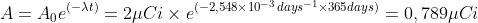 The initial activity of the source is 2 micro Ci. After 1 year = 365 days, the activity of the source will be: