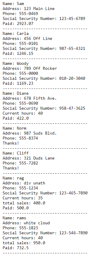 staffList[0] = new Executive("Sam", "123 Main Line", "555-0469", "123-45-6789", 2423.07);