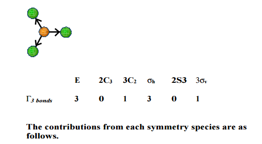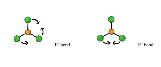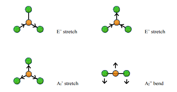 Therefore Γstretch = A1’ + E’ 6) Determine Γbend. We know that Γbend = Γvib - Γstretch Therefore Γbend = E’ + A2” 7) Assign irreducible representations to spectra. From character tables we see that only E’ will be visible in both IR and Raman spectra.