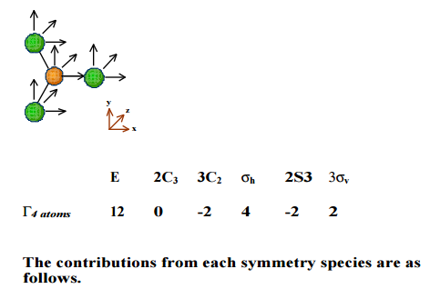 2) Degrees of freedom. BF3 is a non-linear molecule, with 4 atoms. Using the equation 3N, we see that BF3 has 12 degrees of freedom. Using the equation 3N – 6, we see that BF3 has (12 – 6 =) 6 vibrational degrees of freedom. 3) Determine irreducible representations of Γtot. Three axes put on each atom. Γ4 atoms calculated by seeing the effect on the axes by all the symmetry operations