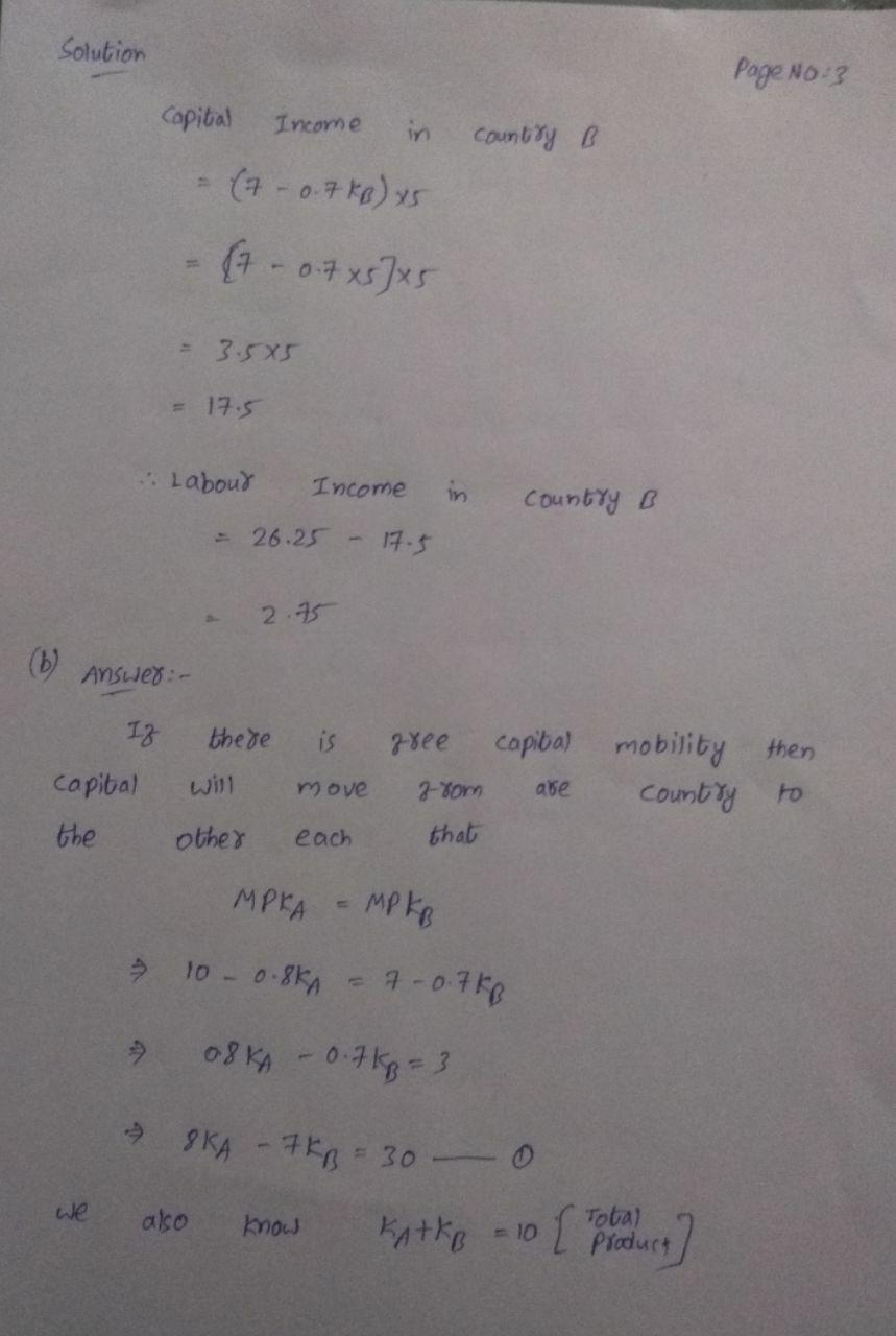 b) Next, consider the case where there is free capital mobility. Find the capital allocation between the two countries, each country’s total income, as well as labor and capital income. What happens to world income? Explain your answers. [Mark: 0.75]