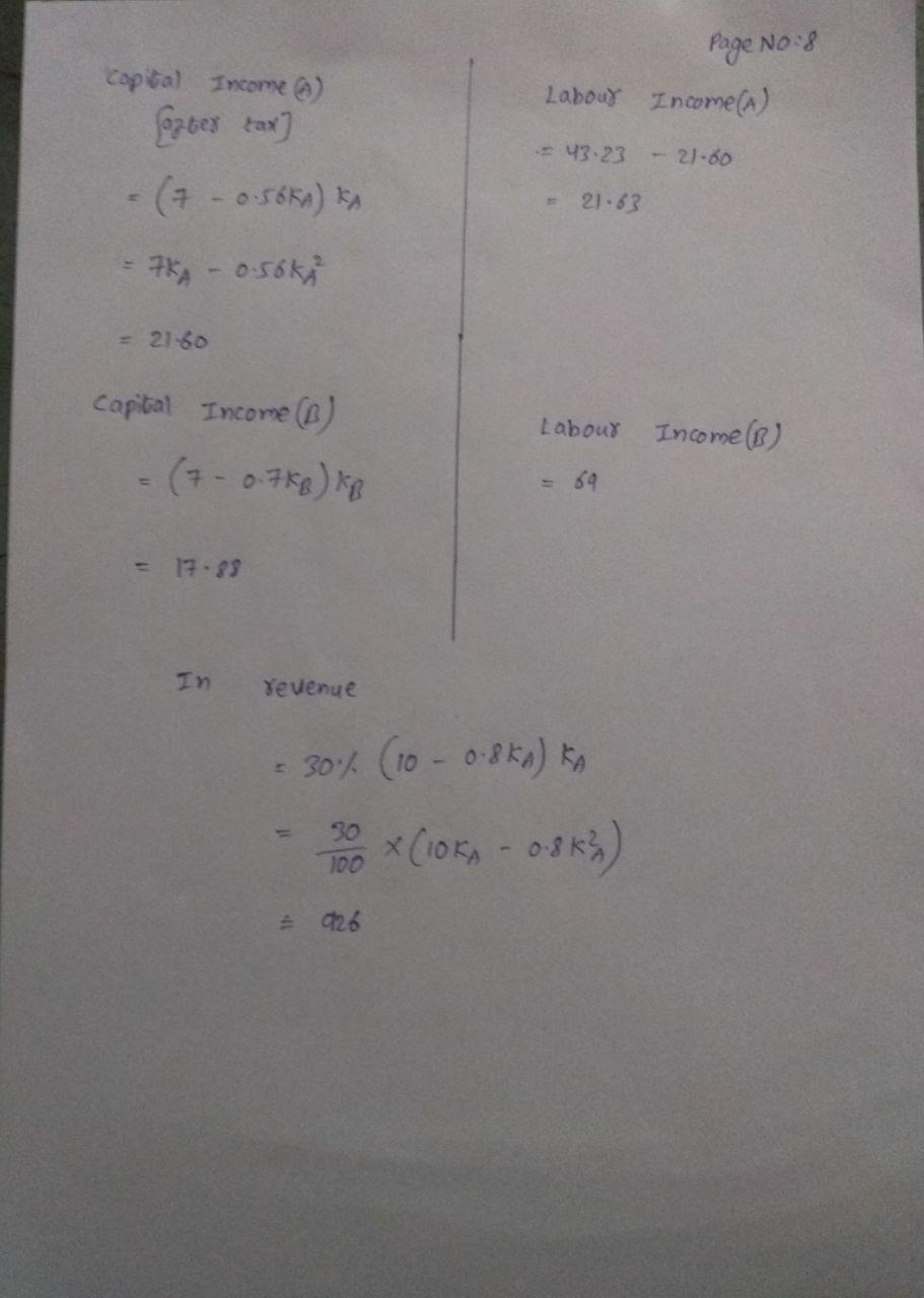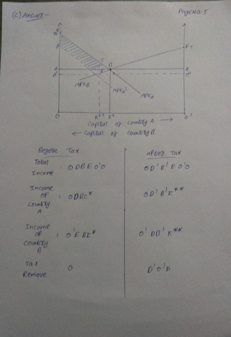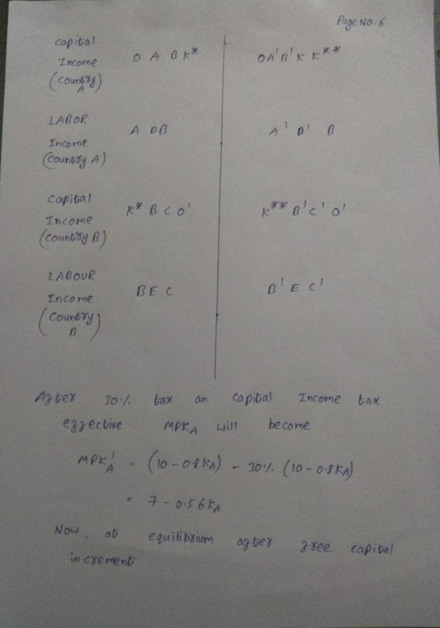 c) Assume now that, succumbing to domestic pressure, the government of country A imposes a 30% tax on capital income. Show graphically the equilibria before and after taxation. Find the new capital allocation between the two countries, total income, tax revenue, as well as labor and net capital income in each country. Explain your answers. [Mark: 1.5] Note: Round your answers to the second decimal point.