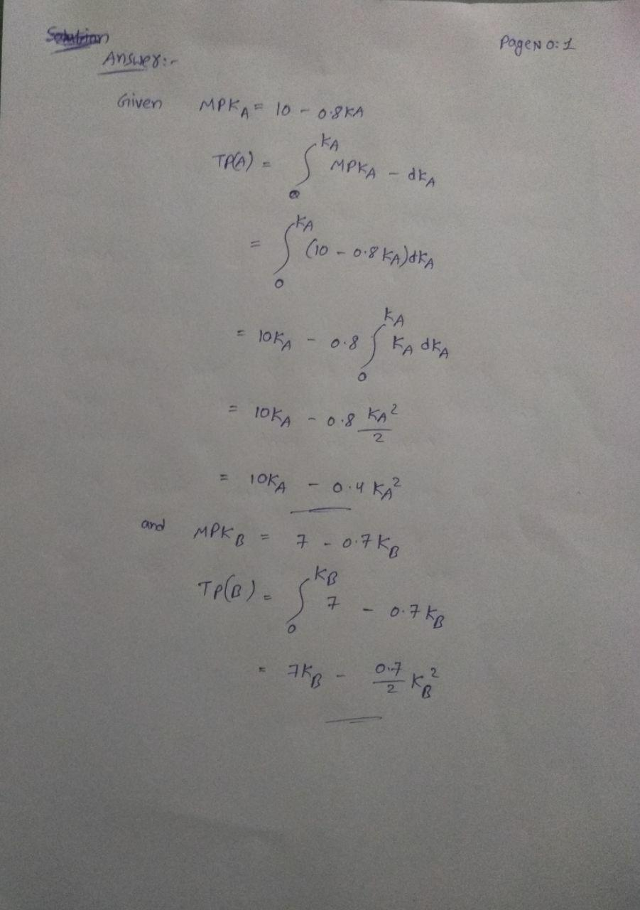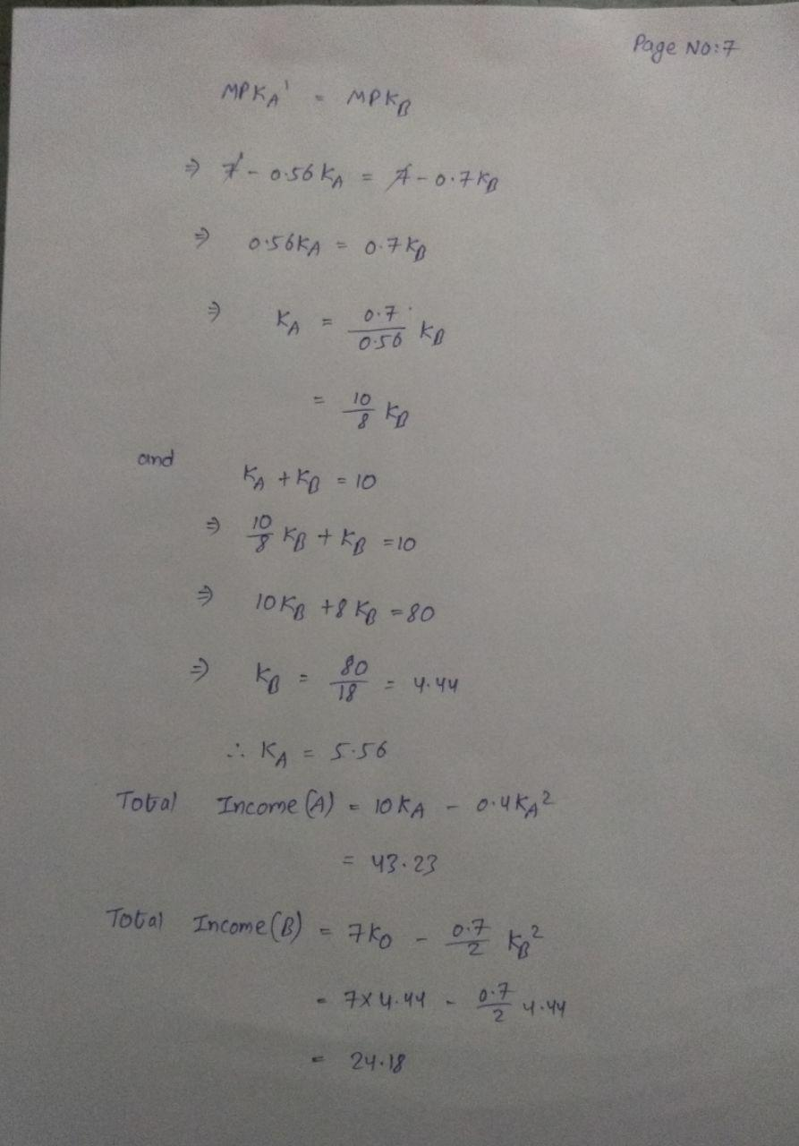 The world comprises two countries, A and B. There is only one good, whose price is normalized to 1; hence nominal and real measures coincide. These two countries differ with respect to their production technology. In particular, ???? = 10 − 0.8?? and ???? = 7 − 0.7??, where ???? denotes the marginal product of capital and ?? the capital stock in country i = Α, Β. The total capital stock in the world is 10 units.