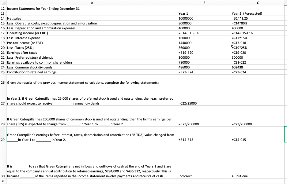 Complete the Year 2 income statement data for Green Caterpillar, then answer the questions that follow. Be sure to round each dollar value to the nearest whole dollar.