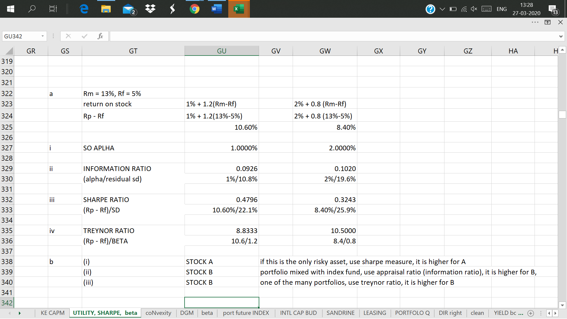 Consider the two (excess return) index-model regression results for stocks A and B. The risk-free rate over the period was 5%, and the market’s average return was 13%. Performance is measured using an index model regression on excess returns. Stock A Stock B Index model regression estimates 1% + 1.2(rM − rf) 2% + 0.8(rM − rf) R-square 0.605 0.451 Residual standard deviation, σ(e) 10.8% 19.6% Standard deviation of excess returns 22.1% 25.9% a. Calculate the following statistics for each stock: (Round your answers to 4 decimal places.) b. Which stock is the best choice under the following circumstances?