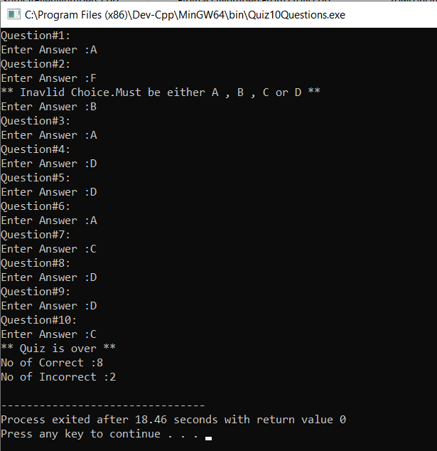 C:\Program Files (x86)\Dev-Cpp\MinGW64\bin\Quiz 10Questions.exe Question#1: Enter Answer :A Question#2: Enter Answer :F ** Inavlid Choice. Must be either A, B, C or D ** Enter Answer :B Question#3: Enter Answer :A Question#4: Enter Answer :D Question#5: Enter Answer :D Question#6: Enter Answer :A Question#7: Enter Answer :C Question#8: Enter Answer :D Question#9: Enter Answer :D Question#10: Enter Answer :C ** Quiz is over ** No of Correct :8 No of Incorrect :2 Process exited after 18.46 seconds with return value o Press any key to continue ....