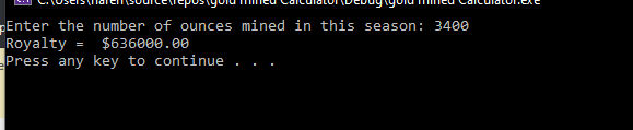 Create a module to calculate the amount of royalties that Parker Schnabel must pay Tony Beets at the end of the gold mining season based on the following contractual agreement. When the amount of gold mined is 3000 ounces or less the rate is 15% of the gold value. This lower royalty rate is stored in a variable named lowerRate. When the amount of gold mined is greater than 3000 ounces the royalty rate is 20%. This higher rate is stored in a variable named goldRushRate and is applied only to the amount over 3000 ounces. The price of gold is currently $1200.00. This amount is stored in a variable defined as priceGold. The number of ounces mined is stored in a variable integer ouncesMined. You should ask Parker to input the number of ounces that he mined this season and print out “Based on x ounces mined, you paid y in royalties.” You will need to multiply the ounces of gold mined by the price by the royalty rate to produce the proper royalties.