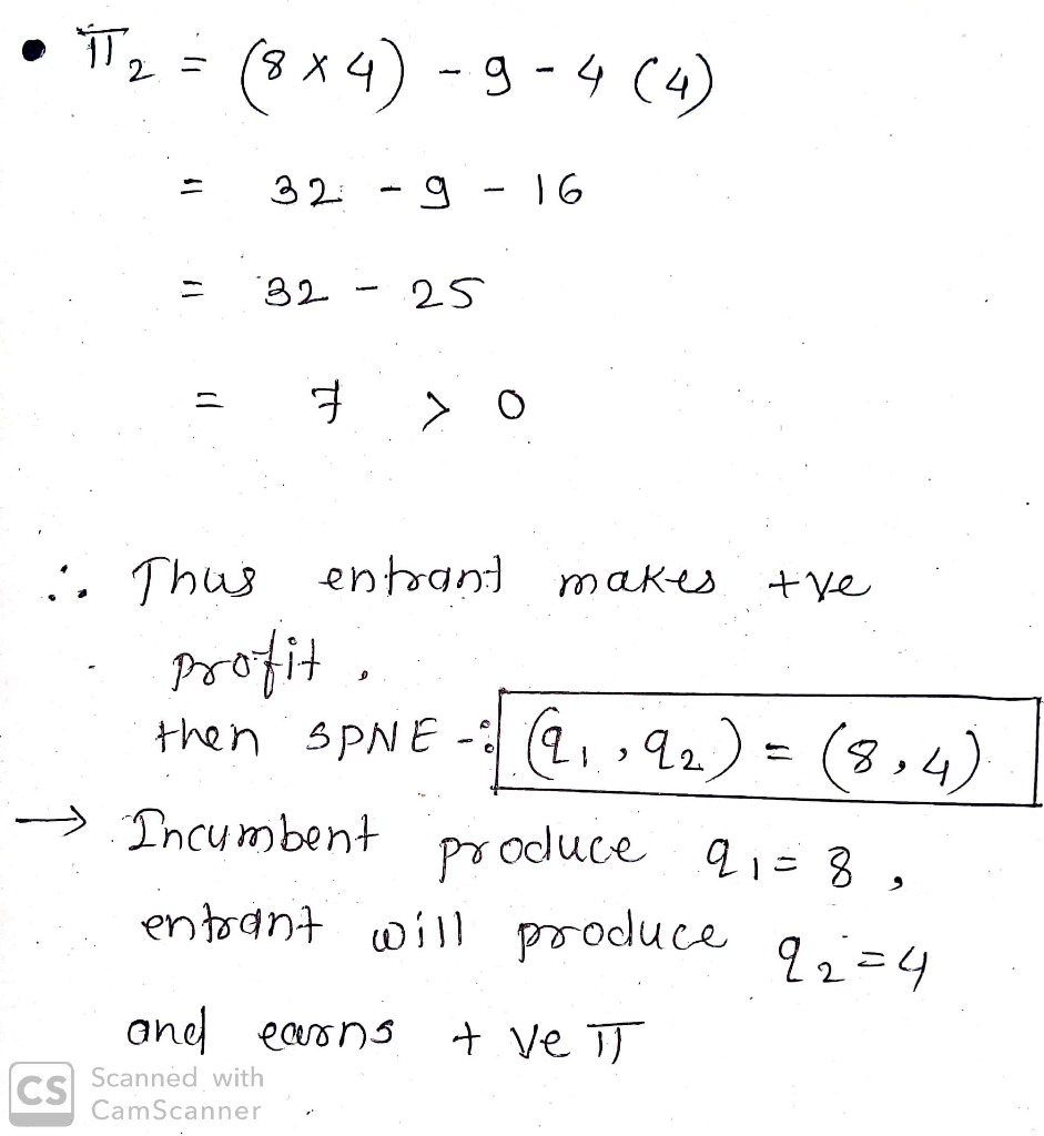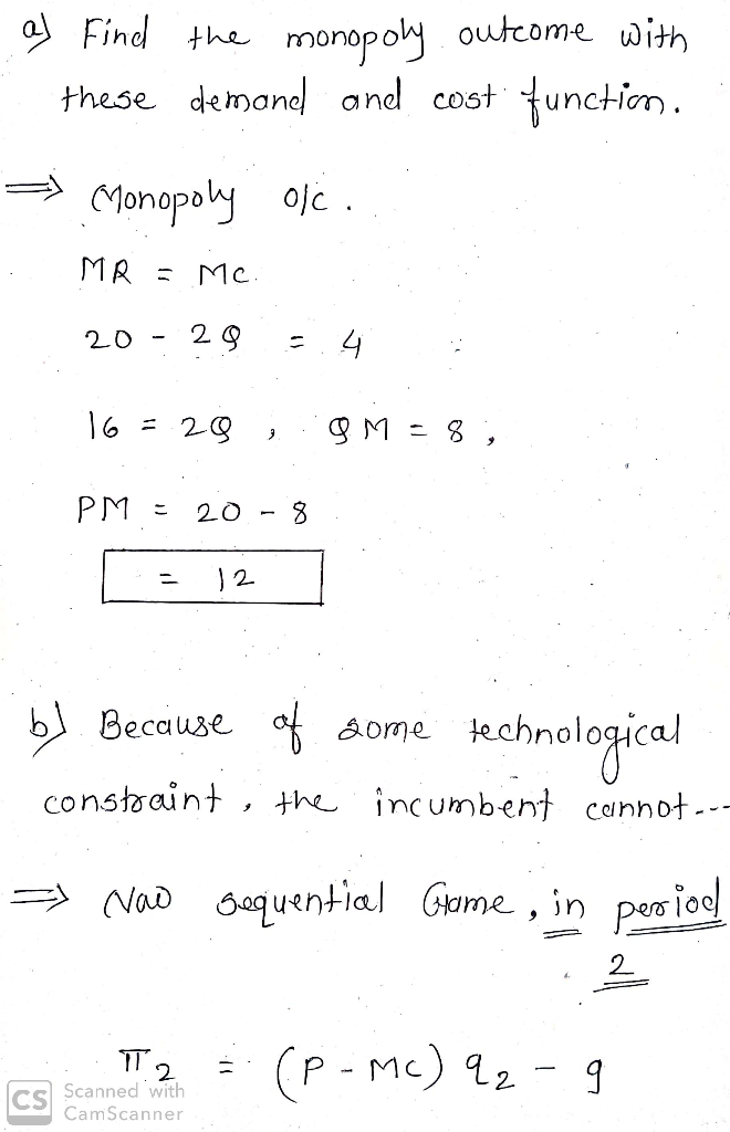 Where is the market operating for two periods. In the first period, there is only an incumbent firm, and an entrant may enter in second period. The demand function is period is P=20 - Q, where Q is the total quantity in the market. the par period cost function of each firm is c(q)=9+4q . There is no ...