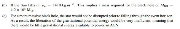 c) If the mass of the supermassive black hole exceeded the mass found above, what would be the implication in terms of the energy release of the infalling star? Could infalling stars effectively power AGNs in this case?