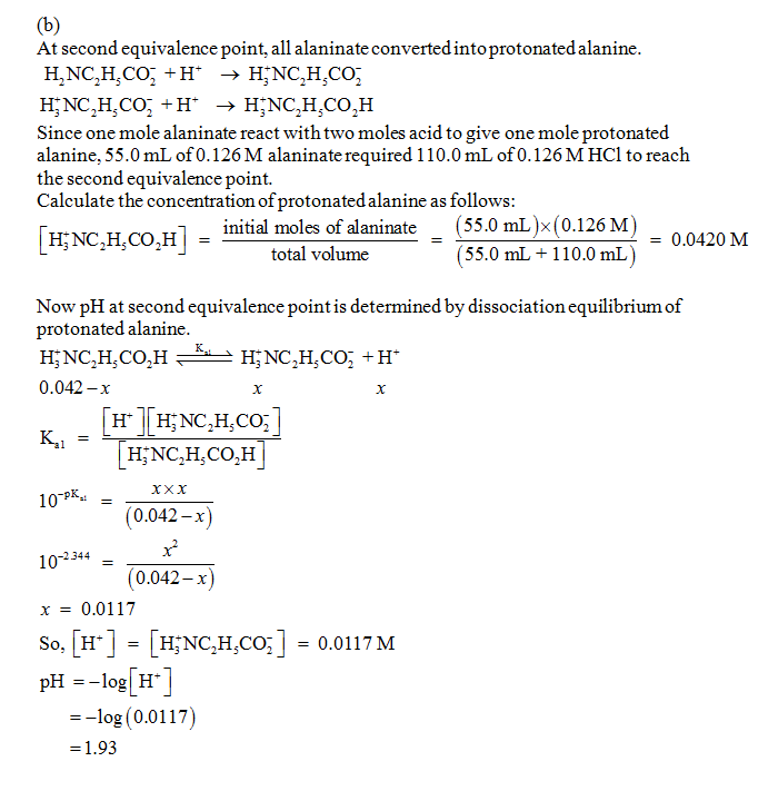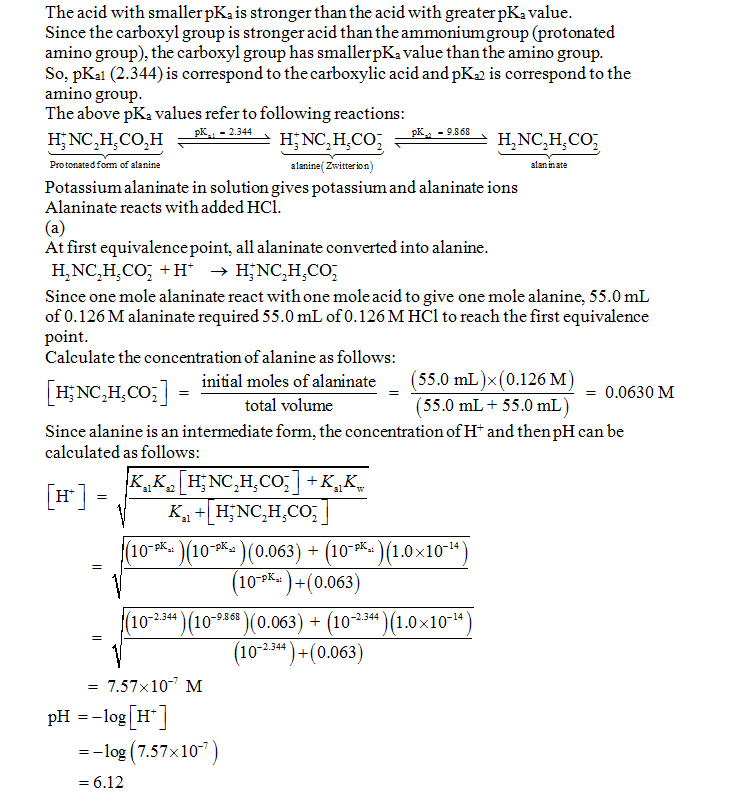 A 55.0 mL solution of 0.126 M potassium alaninate (H2NC2H5CO2K) is titrated with 0.126 M HCl. The pKa values for the amino acid alanine are 2.344 (pKa1) and 9.868 (pKa2), which correspond to the carboxylic acid and amino groups, respectively. a) how do you calculate the PH of the first equivalent and b) the second equivalent? please help