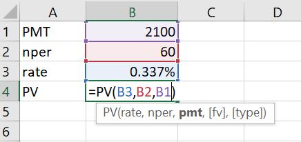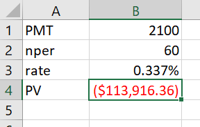 The present value of $2100 per month for 5 year is $113,916.35. Calculation is given below: