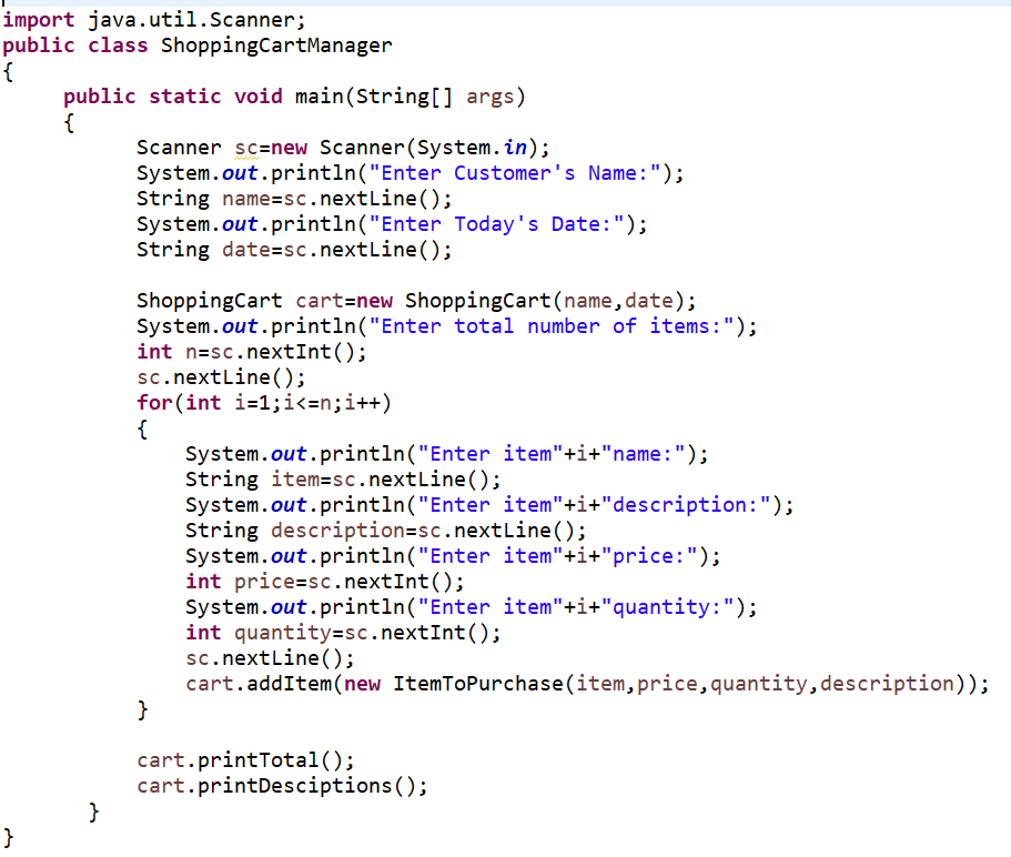 Write a shoppingcartmanager.java that contains a main method for this code in java