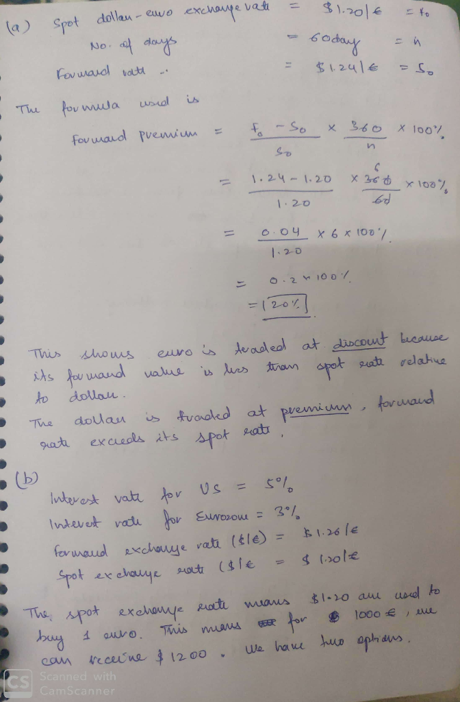 a. Suppose the spot dollar-euro exchange rate is $1.20/€ , and the 60-day forward rate is $1.24/€. Is the euro selling at a forward discount or premium? What about the dollar?