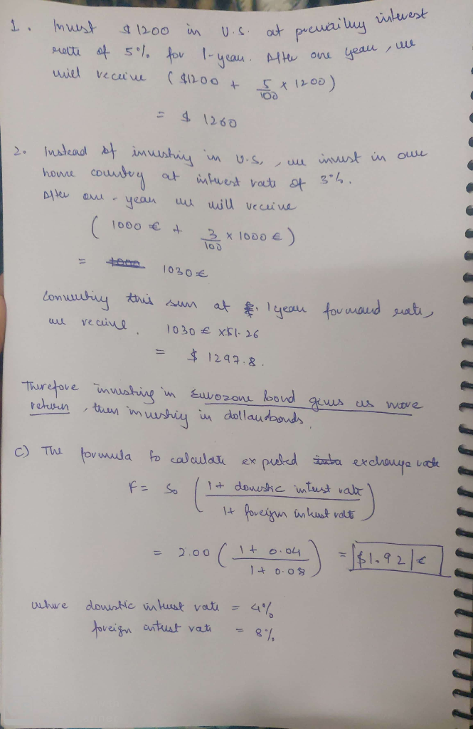b. Now suppose the interest rates on one-year U.S. and Eurozone (EMU) bonds are rUS = 5% and rEMU = 3%. You expect that, one year from now, the dollar-euro exchange rate will be at $1.26/€. Today the rate is $1.20/€. Which should you invest in, the U.S. or EMU bond? Explain Hint use uncovered interest rate parity to get your answer.