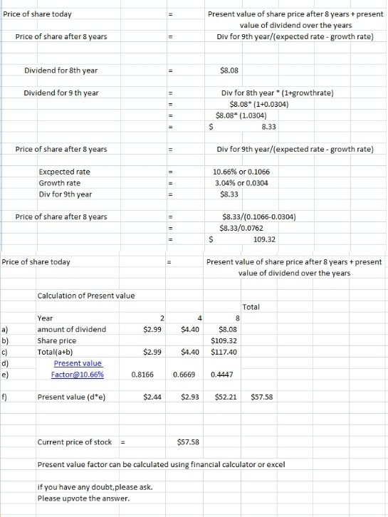 If 1) the expected return for Litchfield Design stock is 10.66 percent; 2) the dividend is expected to be 2.99 dollars in 2 year(s), 4.4 dollars in 4 years, and 8.08 dollars in 8 years; and 3) after the dividend is paid in 8 years, the dividend is expected to grow by 3.04 percent per year forever, then what is the current price of the stock? If no expected dividend is mentioned for a given year, assume the expected dividend is $0 for that year.
