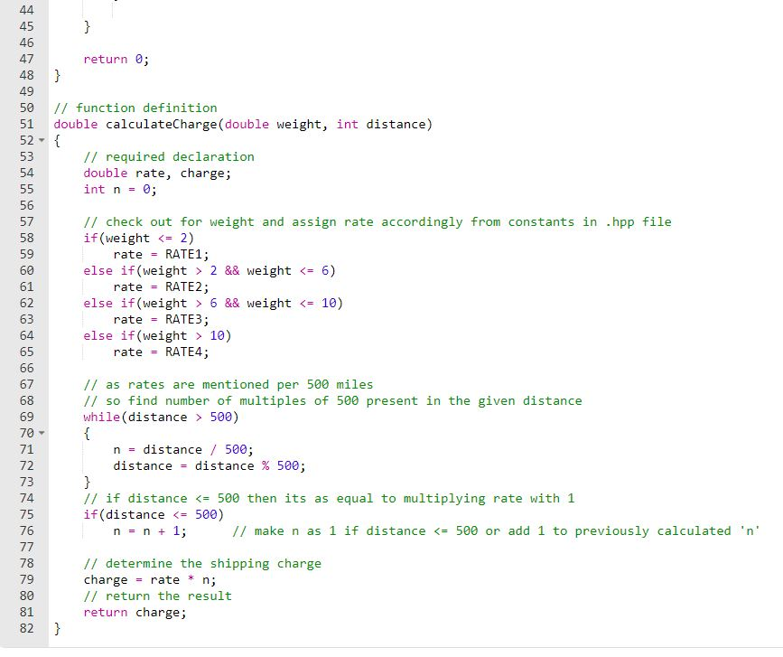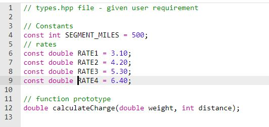 This function calculates the charge based on the package weight as well as the distance. The rates per weight are defined in types.hpp. And that rate is multiplied by how many 500 mile segments the package will be traveling. For instance, if the distance is 1-500 then the rate is multiplied by one. If the distance is 501-1000 then the rate is multiplied by two. 1001-1500, multiplied by three, and so forth.