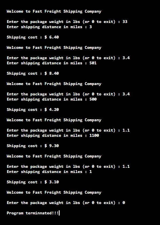 Welcome to Fast Freight Shipping Company Enter the package weight in lbs (or 0 to exit): 3.4 Enter shipping distance in miles: 501 Shipping cost: $8.40 Enter the package weight in lbs (or 0 to exit): 3.4 Enter shipping distance in miles: 500 Shipping cost: $4.20 Enter the package weight in lbs (or 0 to exit): 1.1 Enter shipping distance in miles: 1100 Shipping cost: $9.30 Enter the package weight in lbs (or 0 to exit): 1.1 Enter shipping distance in miles: 1 Shipping cost: $3.10 Enter the package weight in lbs (or 0 to exit): 0