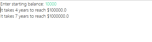 Write a java program that prompts the user for a starting balance and then prints the number of years it takes to reach $100,000 and also the number of years it takes to reach $1,000,000.
