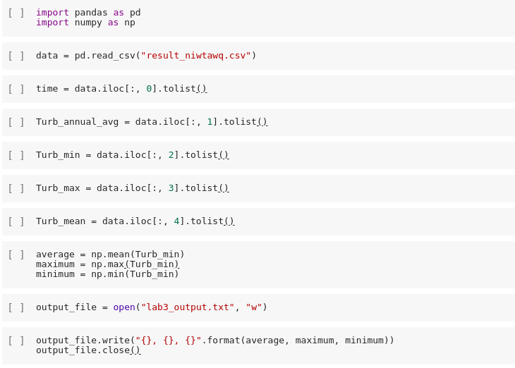 Given a csv file named “result_niwtawq.csv”, extract the data from it. Store the first column data to a list named time, second column data to a list named Turb_annual_avg, third column data to a list named Turb_min, fourth column data to a list named Turb_max, fifth column data to a list named Turb_mean. Calculate and write the average, maximumand minimumof Turb_min to a file named “lab3_output.txt”.