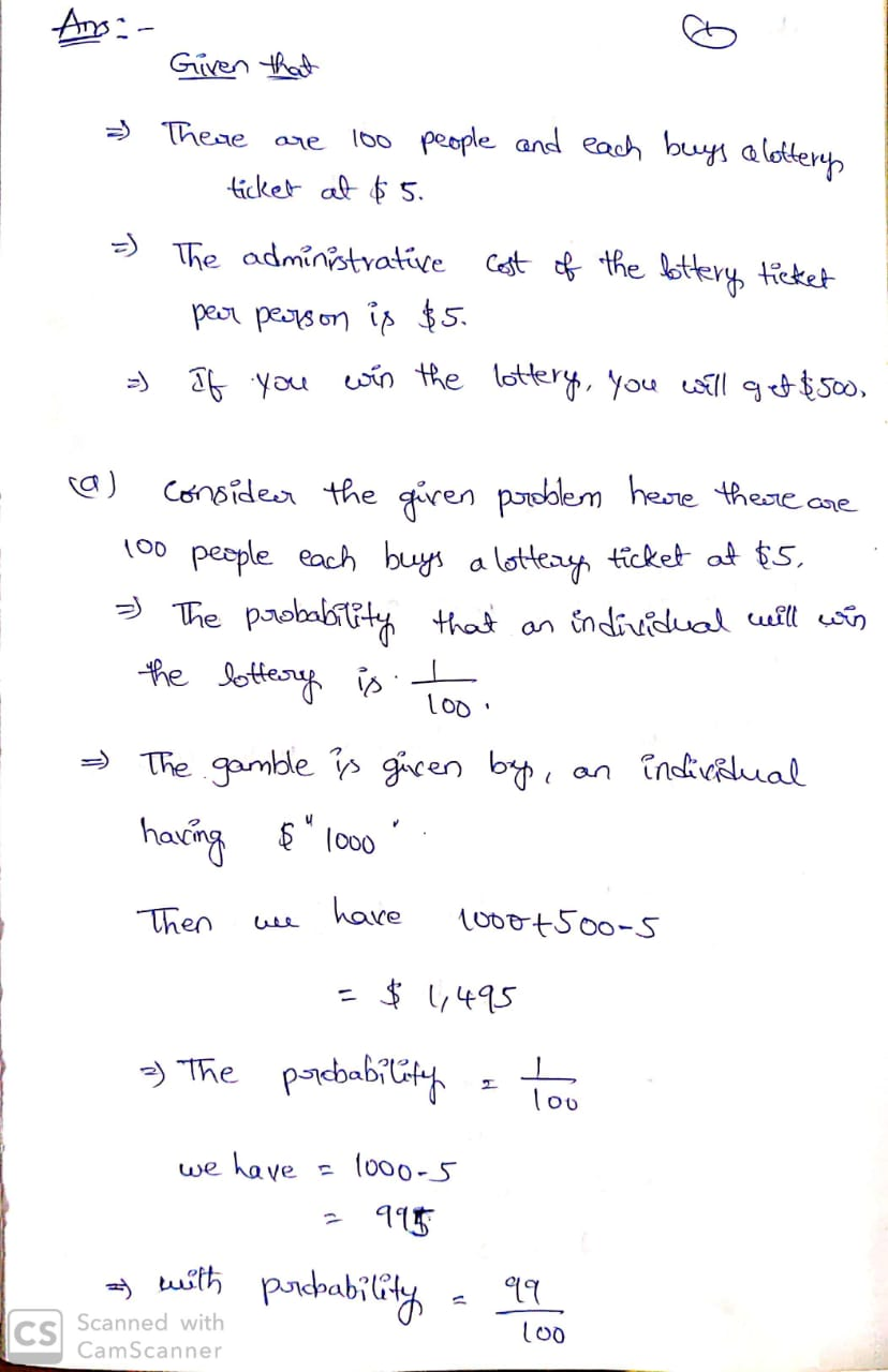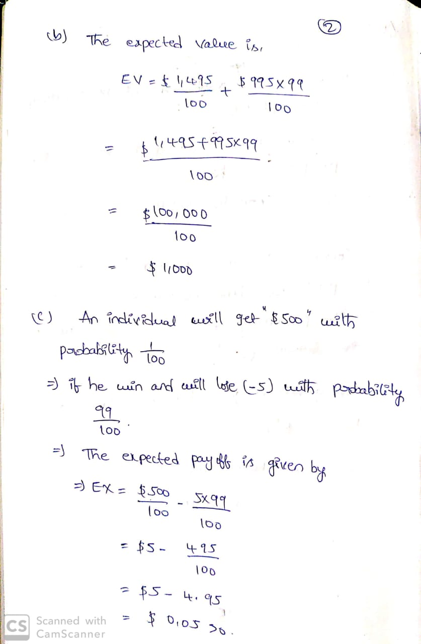 Lottery – Let $1,000 be your current wealth. There are 100 people and each buys a lottery ticket at $5. The administrative cost of the lottery ticket per person is $5. If you win the lottery, you will get $500. There is only one person who can win the lottery. (The cost is 5+5 not 5)