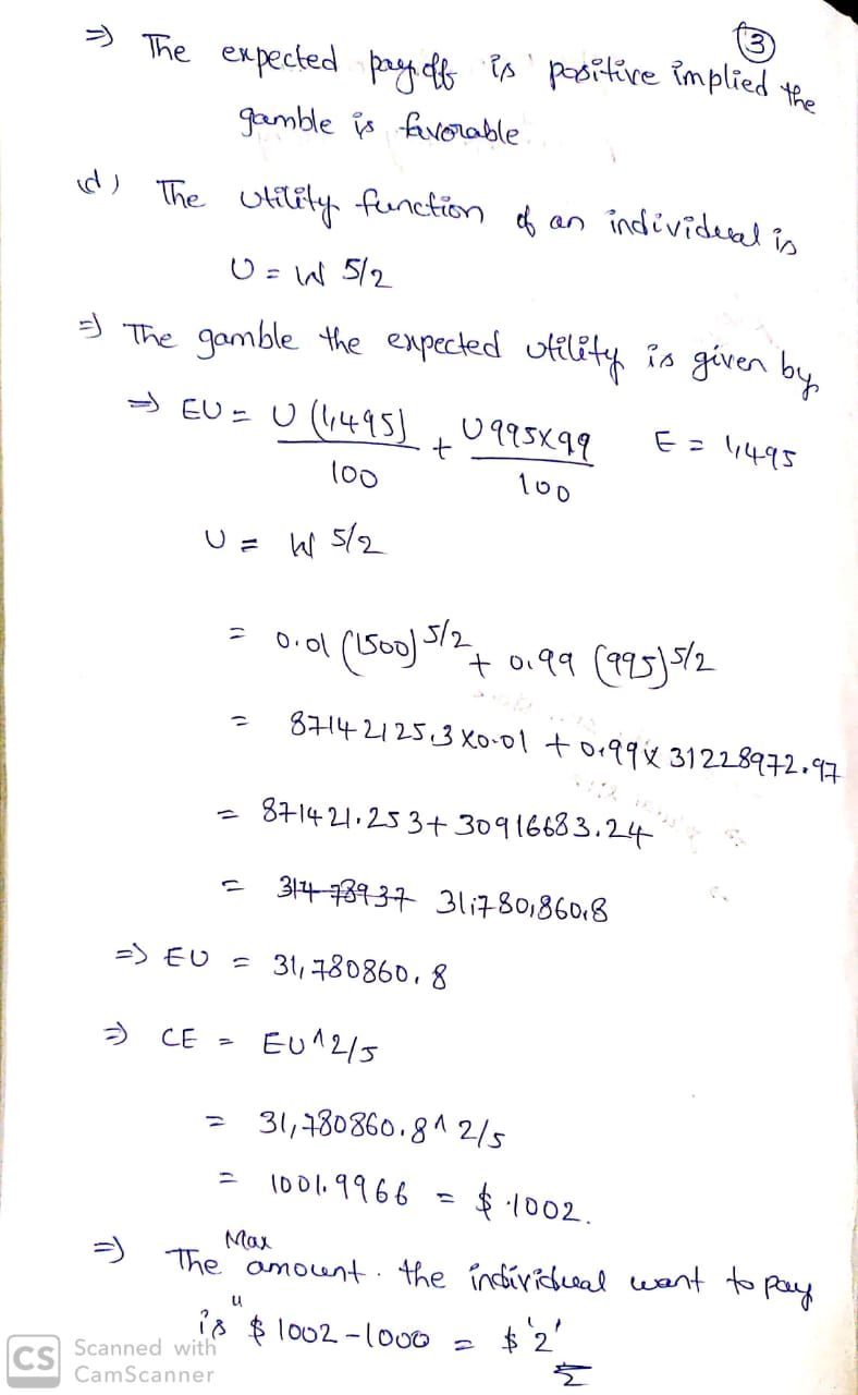 d. Now, suppose your utility function is ? = ?5/2 . Calculate the Certainty Equivalent and the risk premium for individual willing to buy the lottery (i.e., minimum amount of money he/she needs to receive to forgo the lottery)?.