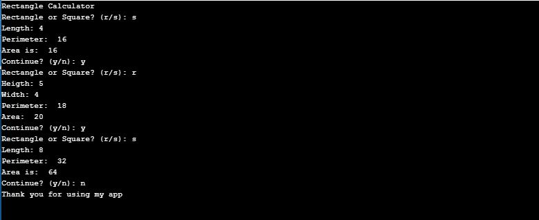 Calculator Continue? (y/n): y Rectangle or square?