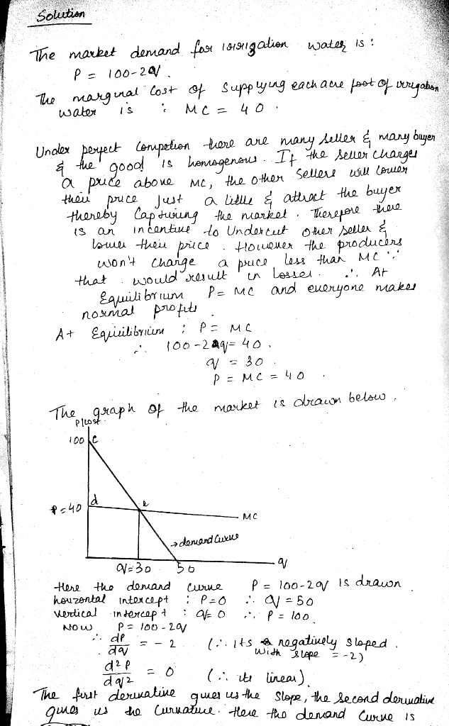 Irrigation water is supplied in units called acre-feet. Suppose that the marginal cost of supplying each acre-foot of irrigation water is $40, and the market demand for irrigation water is P = 100 - 2q.
