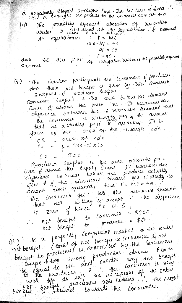 i) Graph this market. Assume it is perfectly competitive. ii) What is the privately efficient allocation of irrigation water? iii) Calculate market participants' net benefits. iv) How are net benefits distributed between consumers and producers in this market?