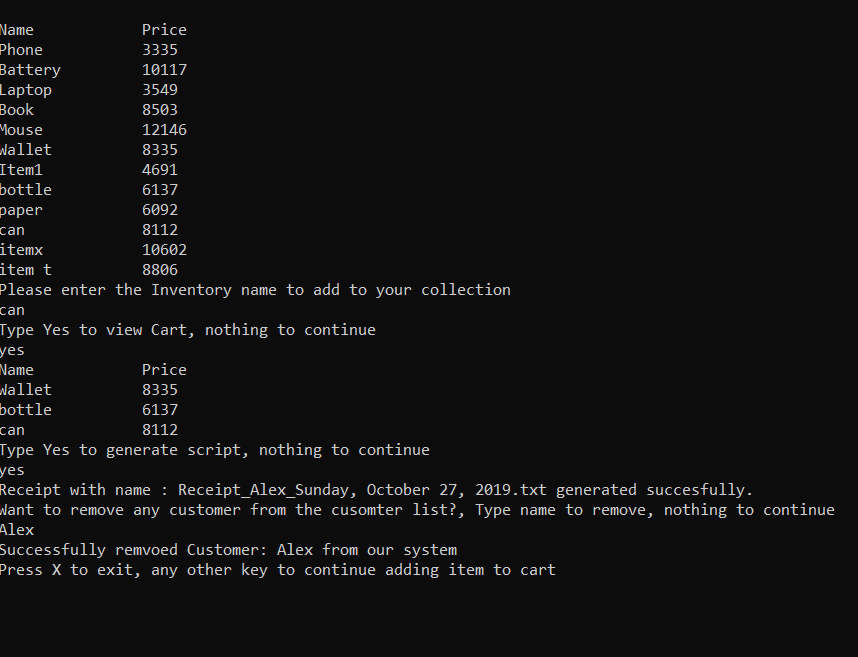 The receipt contains: Customer name Time of transaction List of items purchased (name & cost) Total cost of items Feel free to add a sub-total and tax (not required). A new receipt file is generated for each completed purchase. Do not overwrite or append to a previous file. The file name: Indicates which customer completed the purchase. What order the receipts were generated. There is more than one good solution to this requirement, do not seek help for this feature - use critical thinking.