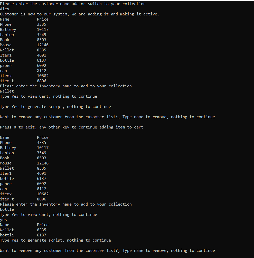 Question: In C#: For today's lab you will be creating a store inventory management system. Your program will have to have the following elements. It should allow any number of customers to shop at the store using names to identify each one. The user should be able to select which one is the current customer. The system must contain a list of at least 50 items (repeats are allowed) that can be purchased by the customers. For a customer to make a purchase they must transfer the items they wish to buy to their own shopping cart. (A Shopping cart list should be maintained for each customer). The user should be able to switch between customers without losing the contents of each customer's cart. The user can select complete purchase and will be presented with a total for that user’s purchases. Customers should be able to remove items from their cart and return them to the stores inventory. A customer’s cart should be removed after her/his purchase is complete. NOTE: The code structure and guidelines are light because this exercise is designed to test your critical thinking skills and see how you apply the skills you’ve learned throughout the duration of this class.